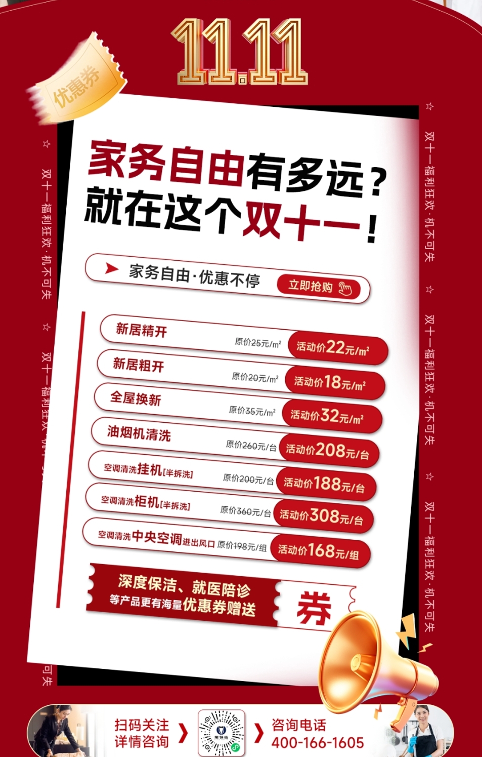 家务自由,点亮生活 双十一英玺家政钜惠 做家务不必再烦恼,这个双十一,让英玺带你解放双手,享受从容美好生活! 【英玺动态】家务自由有多远?就在这个双十一! 还在为繁琐的家务琐事烦恼吗?想要享受生活的每一刻,却被家务束缚了脚步?这个双十一,让英玺服务为您的家居生活带来一场前所未有的革新! 家务自由,其实并不遥远。就在这个双十一,用实惠的价格,享受英玺高品质的家政服务,让您的生活更加轻松自在。 快来抓住这次难得的机会,解放双手,拥抱美好生活吧! 英玺员工工作风采 图源:茵澳公司自行拍摄