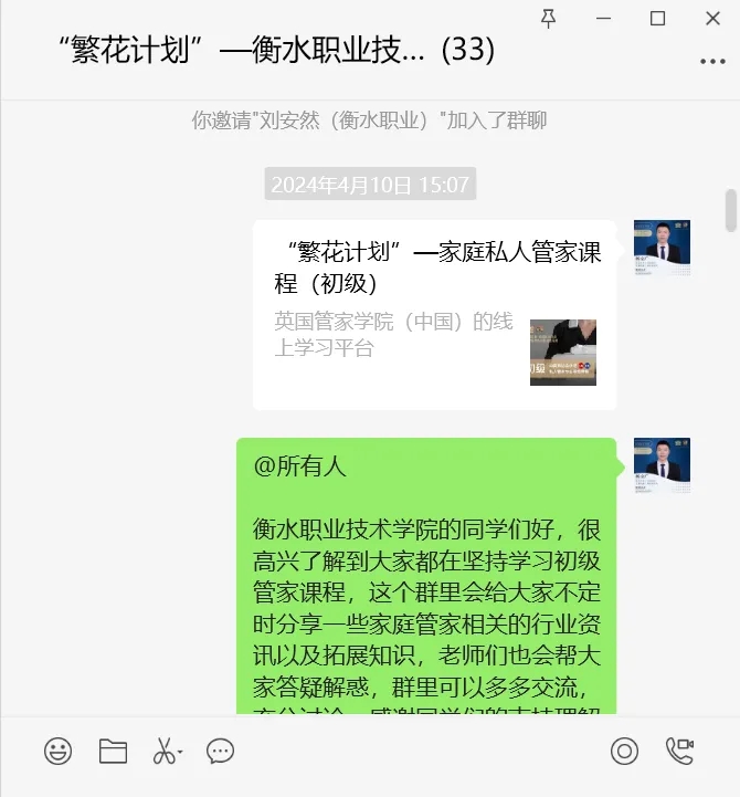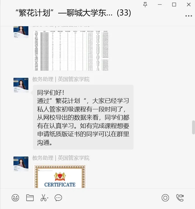 繁花计划正式实施两个多月来,受到了家政专业高校、品家政公司的认可,各机构积极入驻。首批一百多名大学生获赠课程,他们热情饱满的投入到《私人管家初级》课程学习当中。为让同学们获得更佳的学习体验,我们特意组建了以院校为单位的交流群,及时准确的为同学们答疑解惑,实时跟进大家的学习进度,并有效的提醒和监督。“繁花计划”初级课程作为新手的入门,可以帮助家政相关专业的学生了解管家概念和文化的普及,了解高端家庭对卫生环境的标准、学会家庭中高档、智能类家用电器的使用方法、以及衣物面料的洗涤熨烫方法、皮具养护知识等,与学生们在校学习的内容形成了强关联的互补和提升。学员们主要通过观看录播视频课程的方式学习,每节课的时长在15~30分钟不等,还可以自由观看免费的公开课。在线学习既能兼顾大学生们在校内的学习时间,又可通过灵活的、自愿的时间安排,收获多一份新知识,考到一个新证书。通过一个多月的学习,首批大学生中已有80%的同学顺利完成了课程任务,并得到了网校平台的电子证书。同时英国管家学院也收到了十多名学生提交的对私人管家纸质版证书的申请。在经过收集资料、制印证书、快递邮寄一系列过程后,第一批申请纸质证书的学生陆续收到了证书,并向学院的老师们分享了证书照片和学习心得。繁花计划的成功实施,不仅为家政服务行业注入了新的活力,也为提升家政服务品质、满足社会多元化需求奠定了坚实基础。未来,随着更多高校、家政机构的加入和平台的不断完善,相信繁花计划将在家政服务领域发挥更大的作用,为社会创造更多价值。